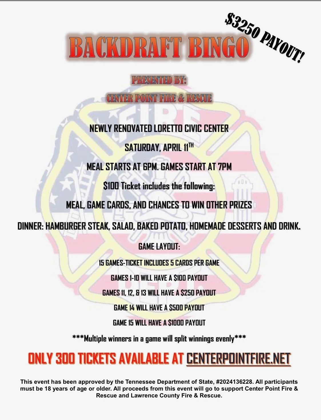 Center Point Fire & Rescue is having a Backdraft Bingo event at the Loretto Civic Center on April 11th. Meal starts at 6pm. Games start at 7pm.