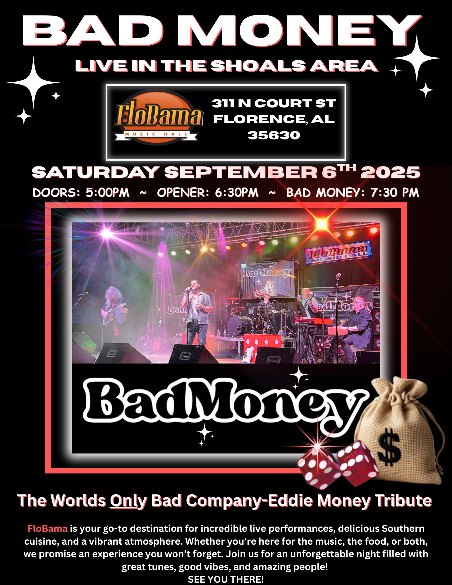 Back to All Events Bad Money Live at FloBama Saturday, September 6, 2025 6:30 PM 9:30 PM FloBama 311 North Court Street Florence, AL, 35630 United States (map) Google Calendar ICS Bad Money will be performing live at FloBama in Downtown Florence on Saturday, September 6th. Doors open at 5 PM, opener is at 6:30pm, Bad Money takes stage at 7:30pm.The world’s Only Bad Company-Eddie Money Tribute
