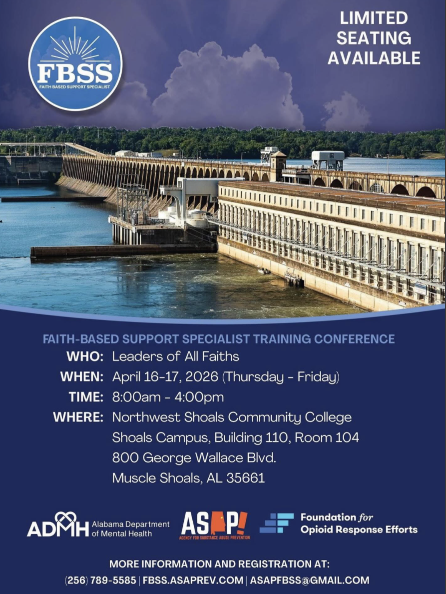 The Agency for Substance Abuse Prevention (ASAP) is proud to announce an upcoming Faith-Based Support Specialist (FBSS) Training Conference to be held on April 16-17, 2026, at the Northwest Shoals Community College, Shoals Campus, Building 110, Room 104 located at 800 George Wallace Blvd, Muscle Shoals, AL 35661.