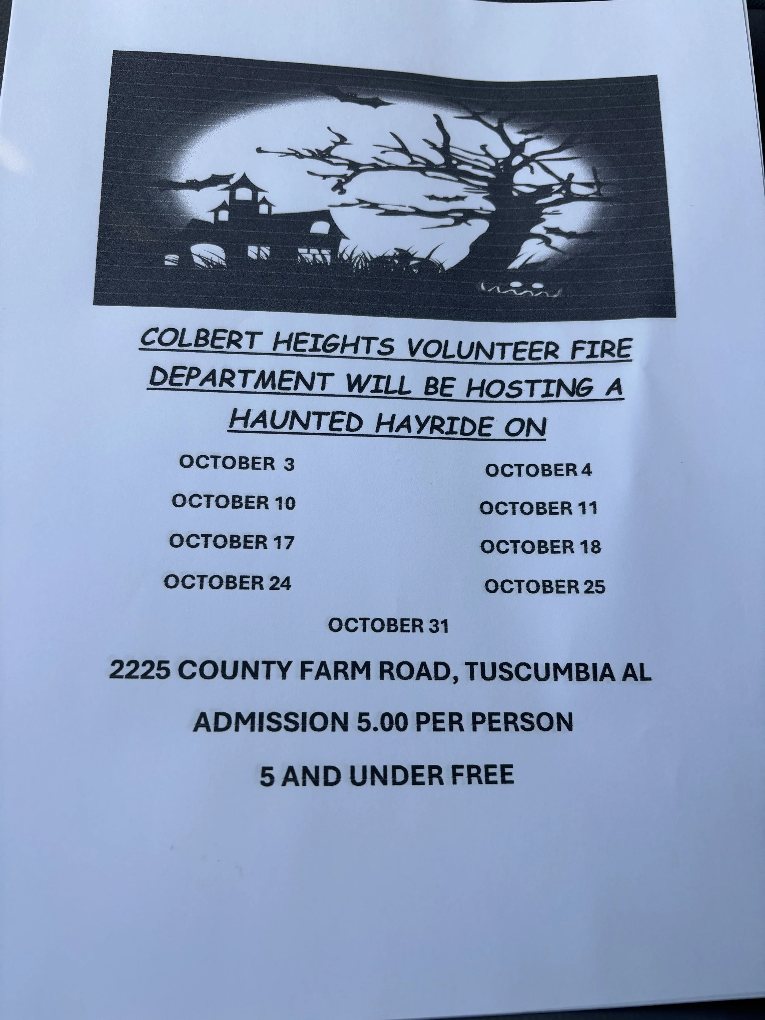 Colbert Heights Volunteer Fire Department will be hosting a Haunted Hayride on every weekend of October leading up to Halloween. The Hayrides start at dusk and continue until the last ride. It will be at 2225 County Farm Rd in Tuscumbia, AL.