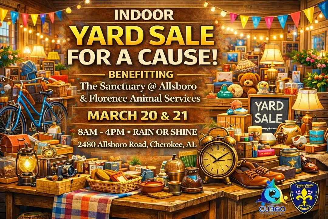 Back to All Events Indoor Yard Sale Friday, March 20, 2026 8:00 AM Saturday, March 21, 2026 4:00 PM 2480 Allsboro Road Cherokee, AL, 35616 United States (map) Google Calendar ICS There will be an indoor yard sale on March 20 & 21 benefitting The Sanctuary @ Allsboro and Florence Animal Services. It will be at 2480 Allsboro Road, Cherokee, AL. TImes are 8AM-4PM.