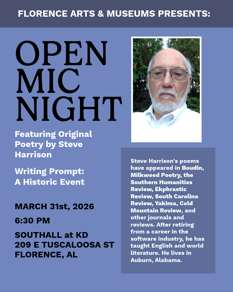 Get ready for a night of poetry at Florence Art & Museums' Open Mic Night, happening on Tuesday, March 31st, 6:30 pm at Southall House, 209 E. Tuscaloosa St., Florence. Featured guest, Steve Harrison, will be sharing original poetry. This month, poets are invited to share their original works that relate to the prompt: A Historic Event.